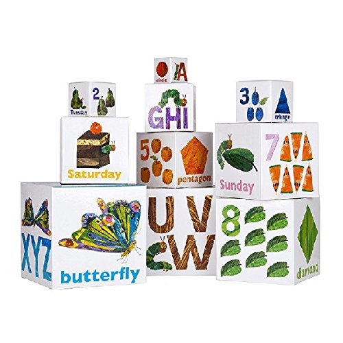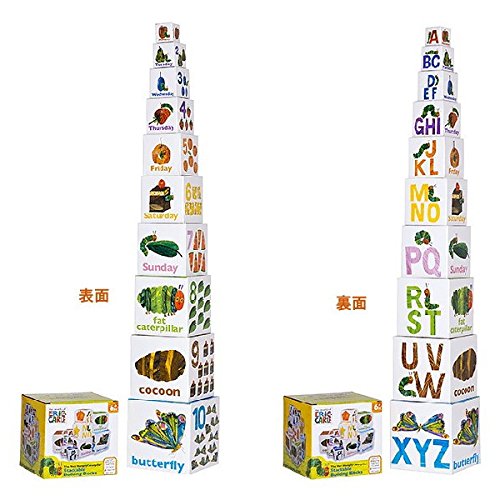 10個のキューブをひとつにまとめてお片づけの練習。繰り返し遊ぶことで大きさの違いや数の理解、また色や曜日などの英単語に触れるきっかけにもなります。目と手を使いながら、積み上げて遊ぶことで集中力、理解力やものに他する意識力が高まります。大きいキューブから順番に積み重ねていくとかわいいあおむしの成長過程が見えます。
