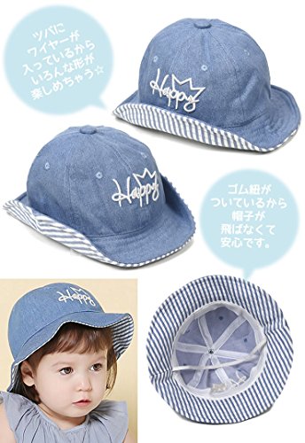 品名 【ベビー キッズ】 デニム happy ハット 45-48cm ワイヤー入り 帽子 UV 日よけ キャップ ゴムひも付 日焼け防止 赤ちゃん 男の子 女の子 ユニセックス UV対策 素材 綿 サイズ 頭回り約45cm-48cm位 生産国 中国