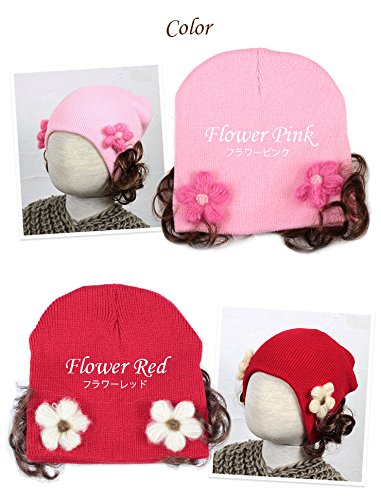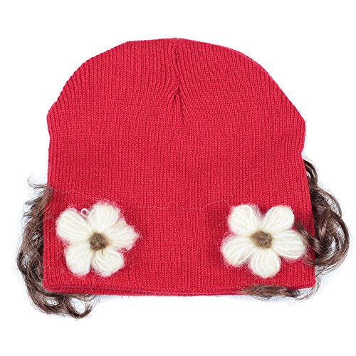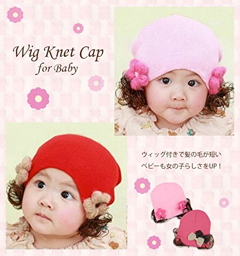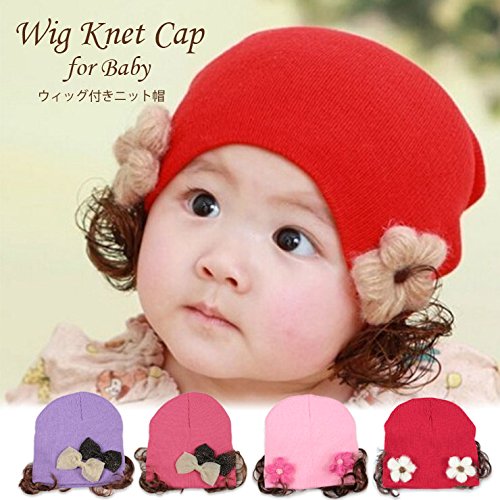 【ノーブランド品】ベビーウィッグ付きニット帽 ベビーサイズ,フラワーレッド