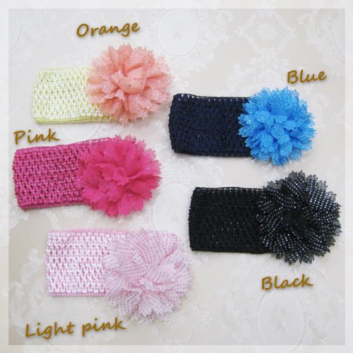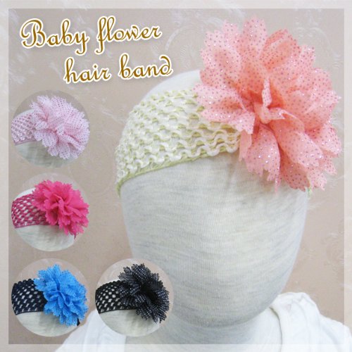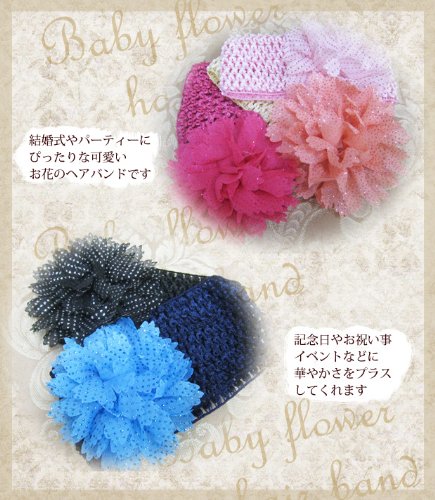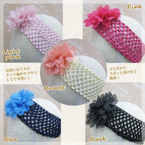 やわらかいレースを使用しているので、頭の柔らかい子供にも安心ですね。 お花モチーフ:直径約9.5cm レースバンド:幅約7cm、長さ約30cm(置き寸) 素材:ナイロン、ポリエステル、ポリウレタン