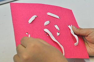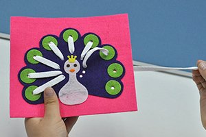 くじゃくの羽根の形に沿って放射線状に紐を通す知育教材。