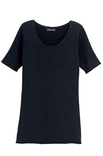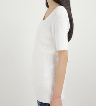 レーヨンと綿なので吸汗性がよいのも好ポイント。暑い季節にうれしい素材です 編み目の凹凸が縦ラインを強調して、伸縮性もあり、体に優しくフィットしてほっそり見えるリブニットです。