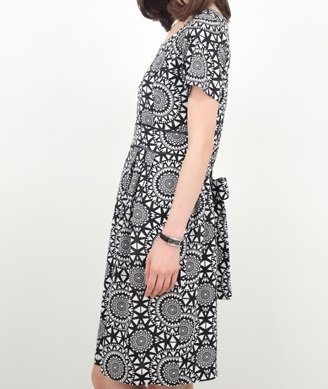 - ●切り替えより上前後プリンセスライン切り替え ウエスト=前タック切り替え、後ギャザー切り替え 前ベルト切り替え部分無地パイピング 共布リボンベルト付調節可後=コンシールファスナー半開
