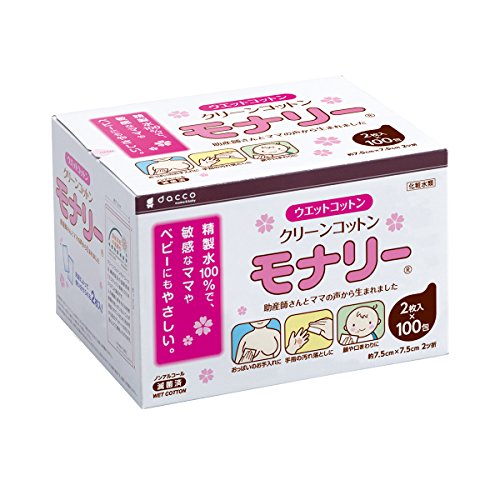 「クリーンコットン モナリー 100包」は、精製水100%含浸、敏感肌にも適したな2枚入・単包滅菌済ウエットコットン(医療脱脂綿)です。授乳時の乳房の清浄・清拭に1枚ずつ使用できます。敏感肌にもやさしい脱脂綿を使用しています。アルミ包装が水分の蒸発を防ぎ、常に清潔な状態で使用できます。アルコール・香料は使用していません。