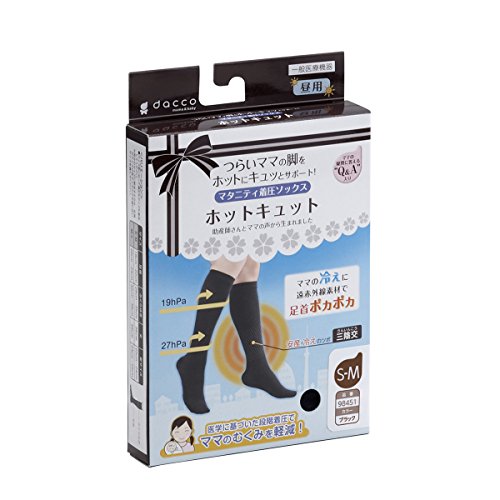 「ダッコ マタニティ着圧ソックス ホットキュット 昼用 ブラック S-M 1足」は、つらいママの脚をホットにキュッとサポートする昼用のマタニティ着圧ソックスです。助産師さんとママの声から生まれました。足首27hPa、ふくらはぎ19hPaの段階着圧でキュッとひきしめてむくみを軽減。ママの冷えには、安産・冷えのツボ(三陰交)周りを遠赤外線素材でポカポカに保ちます。湿気コントロール素材を採用し、ムレにくく、1年中着用できます。S-Mサイズ:足首18-22cm、ふくらはぎ29-35cm、丈36cm、足サイズ22-24cm。一般医療機器。 保管上の注意 ●高温・多湿や直射日光のあたる場所を避けて、乳幼児の手の届かない所に保管してください。