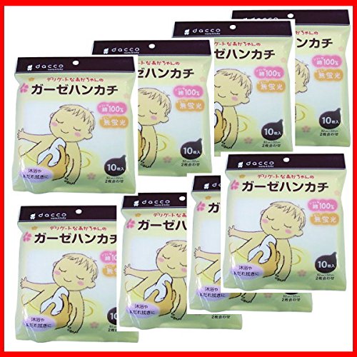 デリケートな赤ちゃんの肌にも最適 ・デリケートな肌にもやさしい無蛍光・コットン100%のガーゼハンカチです。 ・吸水性に優れた、ソフトな肌ざわりの生地です。 ・蛍光増白材を使用していないため、デリケートな赤ちゃんの肌にも最適です。 ・10枚入の8個セット(計80枚)