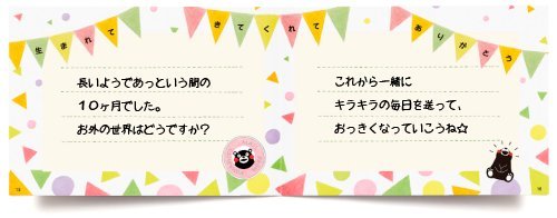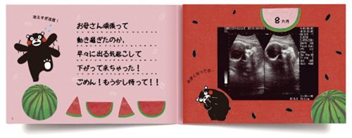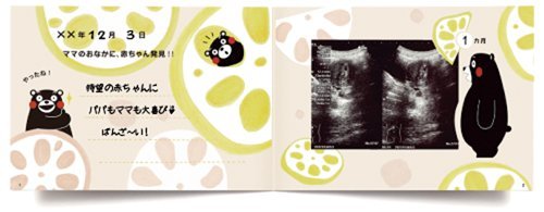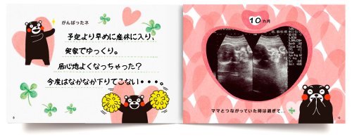 生まれるまでの10ツキ10カを「くまモン」が彩ります。 出産祝いに人気の商品「10ツキ10カものがたり」定期検診のときとっても楽しみにしてたエコー写真、トツキトウカの間にゆっくり母へと変わっていった自分、そして感動の出産・・・。 その小っちゃな手に大きな夢をつかんでね・・・そんな思いを込めて、あなただけ10ツキ10カ間を形に残しておきませんか。 ♪くまモンが登場する「10 ツキ10 カものがたり」 生まれるまでの10ツキ10カを、明るく楽しく彩ります。 【P1-2】ママのおなかに、赤ちゃん発見!!やったね! (コメント・エコー写真が入ります) 【P3-4】ばんぺいゆ食べて スッキリしなっせ (コメント・エコー写真が入ります) 【P5-6】ゆっくり、のんびり・・・ (コメント・エコー写真が入ります) 【P7-8】冷え過ぎ注意! 大きくなってる・・・ (コメント・エコー写真が入ります) 赤ちゃんの写真が入ります" 【P9-10】がんばったネ ママとつながっていた時は過ぎて・・・ (コメント・エコー写真が入ります) エコー写真が入ります"> 【P11-12】うまれるよ!うまれるよ! わくわく どきどき うわあぁーっ (お写真・エコー写真が入ります)エコー写真が入ります"> 【P13-14】ママ、やっと会えたね♪ (誕生記録と生まれた時のお写真が入ります) 【P15-16】ママからのメッセージが入ります。