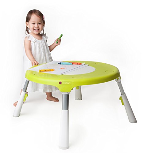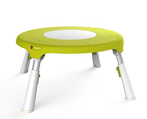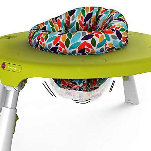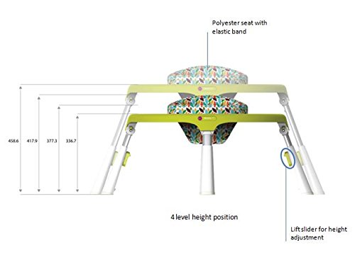 - テーブルの中央部に赤ちゃんの座れるシートがあり、360℃回転するので、赤ちゃんがシートに座った状態で周りのおもちゃで自由に遊ぶことができます。高さは4段階に調節可能で、体格や成長に合わせて長く使うことができます。シートには強力なゴム入りでジャンパーとしても楽しめます。