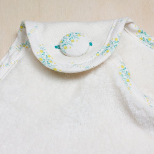 ムートンと間違える程の肌触りのよい、オーガニックコットンの生地を採用したスリーパーです。子供はなかなかお布団のなかで寝てくれないものです。スリーパーはお布団からはみ出しても安心で、産まれてから、3歳位までと長く使用出来ます。オーガニックコットンなので、合成繊維の入ったものと違って静電気が起きにくく、ホコリなども寄せ付けにくいので赤ちゃん等の敏感なお肌の方にも安全です。ふわふわ柔らかで気持ちがよく、暖かいのでお薦めです。パイピングのプリント生地もオーガニックコットンを使用しています。