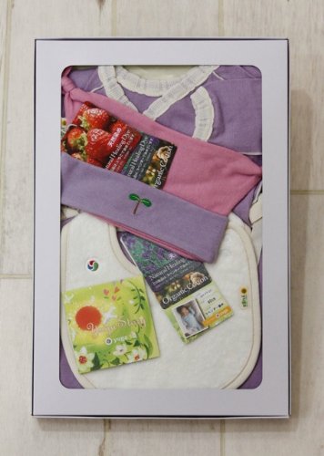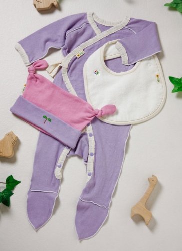 yuga☆【箱入り】「足つきガーゼロンパース 70cm +今治スタイ+ 帽子 3点セット ラベンダー染め」 オーガニックコットン100% 天然染め ベビー 服 子ども服 キッズ 女の子 男の子 兼用 前開き 足つき ガーゼロンパース 長袖 セット品 出産祝い プレゼント 綿100% 無地 おもてなし賞受賞!
