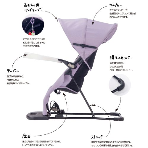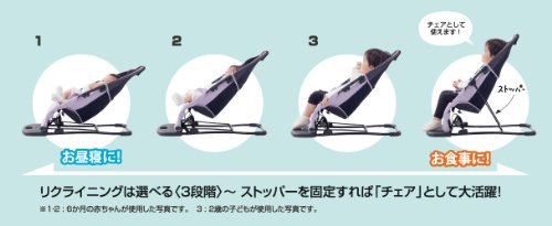 - バウンサー リクライニング角度3段階調節(未使用時):125°、118°、110°。ベビーチェア ストッパーを固定すればチェアとしてご利用できます。テーブルをつければ、お食事チェアとして大活躍。