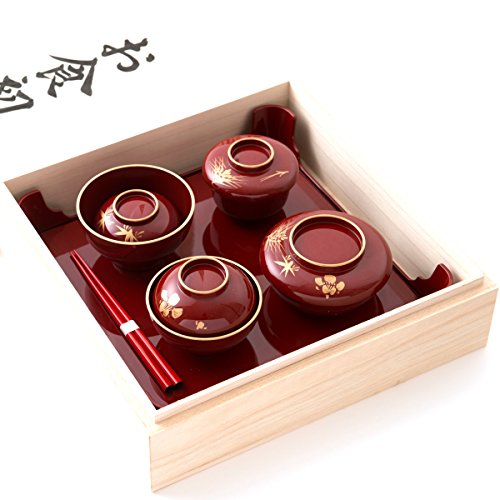 - (寸法は約、単位cm)膳:25.5x25.5x高さ5.8 お箸:18 飯椀:φ10x高さ6 汁椀::φ9x高さ8 つぼ椀:φ8.5x高さ7 平椀:φ10x高さ6