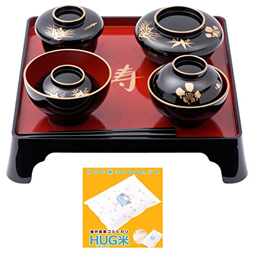 - (寸法は約、単位cm)膳:25.5x25.5x高さ5.8 お箸:18 飯椀:φ10x高さ6 汁椀::φ9x高さ8 つぼ椀:φ8.5x高さ7 平椀:φ10x高さ6