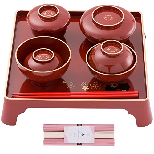 - (寸法は約、単位cm)膳:25.5x25.5x高さ5.8 お箸:18 飯椀:φ10x高さ6 汁椀::φ9x高さ8 つぼ椀:φ8.5x高さ7 平椀:φ10x高さ6