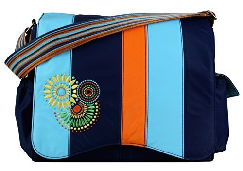 Magnetic clip closure, Two outside pockets, three interior pockets, Coordinating zippered pouch, large fold-out changing pad, and matching insulated bottle bag