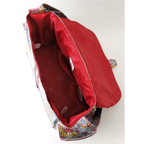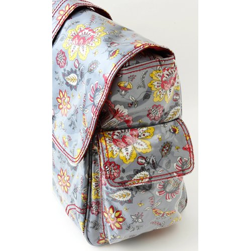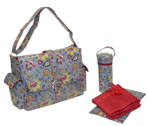 A magnetic clip keeps the top flap closed & The polyurethane exterior coating makes clean up a snap! Roomy interior with 3 pockets and 2 elastic bottle holder loops, Adjustable shoulder strap & 2 outside pockets. Includes matching ThinsulateTM insulated bottle bag, Coordinating zippered pouch & Large fold-out padded changing pad. Kalencom Diaper Bags are AZO free. We use no Phthalates/DEHP, DBP, or BOP in our PVC.Dimensions: 14"L x 6"W x 11"H