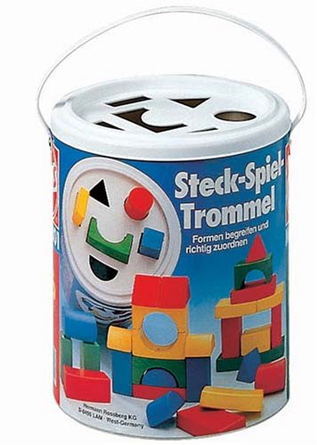 ドイツ・ハーマンロスバーグ社製「筒入積み木(パズル)」。さまざまな形の積み木が入ったセット。ドイツの良質な木から作られたシンプルで飽きのこない木製玩具で、材料にはカエデとブナを使用している。塗料は食品衛生法に基づいた着色料を使用している。パッケージサイズ217×180φ。
