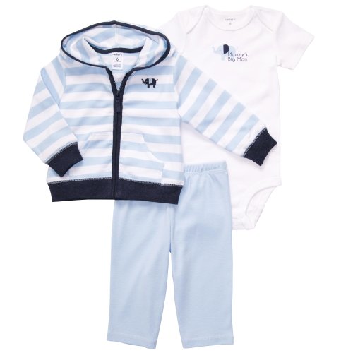 You'll never forget how cute he looks in this hooded cardigan, pull-on pants and "Mommy's Big Man" slogan bodysuit with elephant graphic.