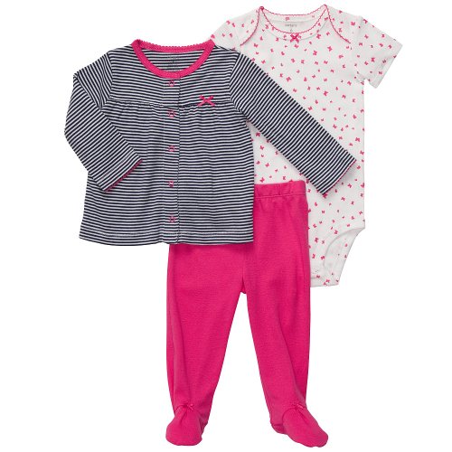 - Set includes long-sleeve snap front cardigan, short-sleeve bodysuit and pants with built-in footies