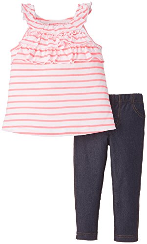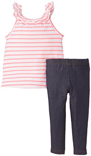 Set includes 1 ruffled tank and capri-length jeggings;No-pinch elastic waistband on denim-look jeggings;Zoom in to see bright colors and ruffles;Tank: 100% cotton jersey; jeggings: 72% cotton, 26% polyester, 2% spandex;machine wash