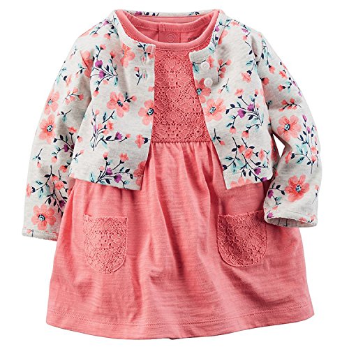 Includes dress with built-in bodysuit and cardigan;Nickel-free snaps on reinforced panel;Button-front design with lace yoke and pocket details;100% cotton jersey;Machine wash