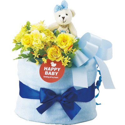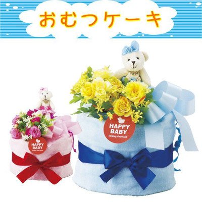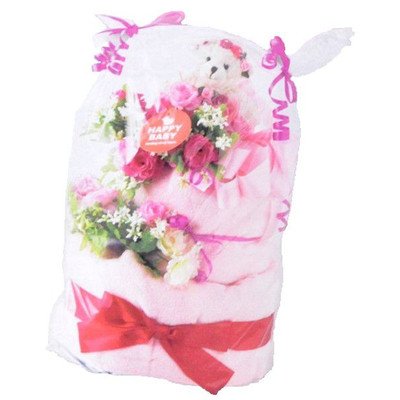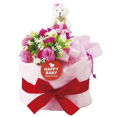 人気NO.1の「パンパース」を一つずつ丁寧にフィルムで包装し、ふわふわタオルで包み、デコレーションケーキに見立てた可愛いおむつケーキ ケーキの上には可愛いくまのぬいぐるみが祝福してくれています。 安心・安全な贈り物をサプライズで演出 サイズ/おむつケーキ:約200×200×30mm、くまのぐいぐるみ:全長130mm 素材/おむつ:パンパース紙おむつ16枚 箱寸法:250×250×350mm 総重量/500g 生産国/日本国