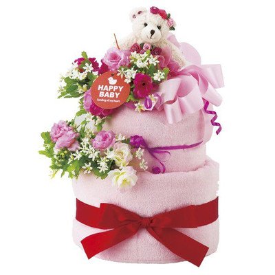 ふんわりタオルに包まれたおむつのケーキを出産祝いに