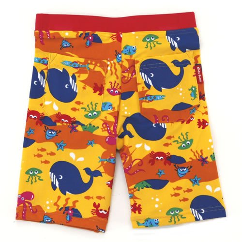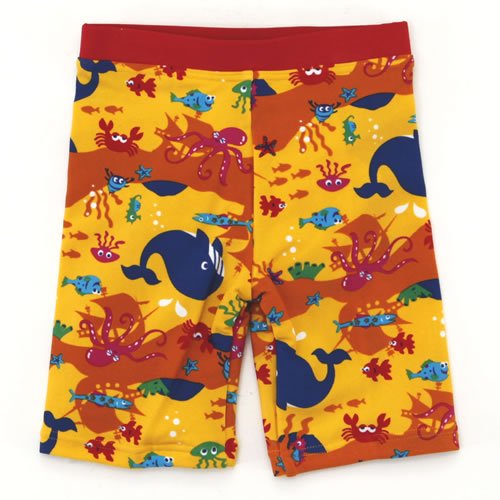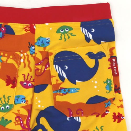 • 山吹色の生地にクジラやタコ・タツノオトシゴなどの海の生き物が全体にプリントされたスイムパンツ(水着)です。