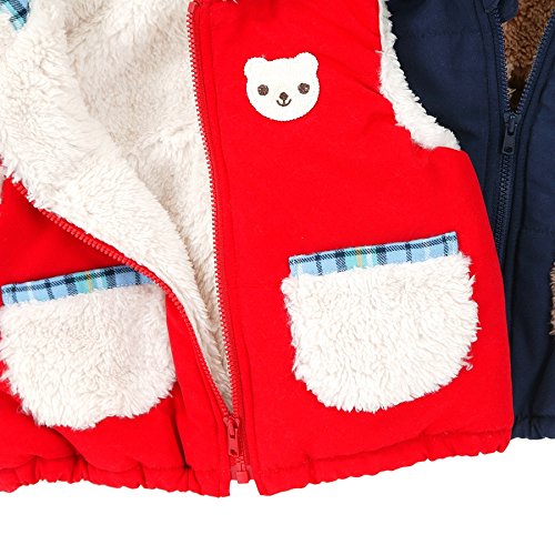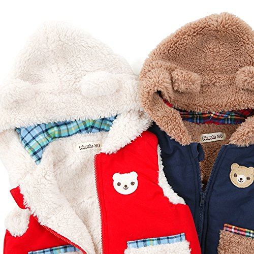 季節のかわり目に大活躍の中綿ベストはフードにくま耳がついているのもかわいくて嬉しいポイント☆元気なレッドと、合わせやすいネイビーの2色展開でどちらの色もオススメ!!