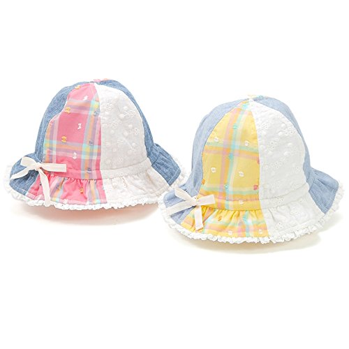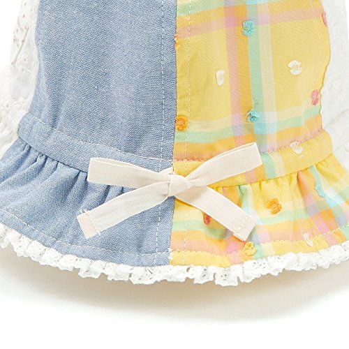 カラフルチェック×レース×ダンガリーを合わせたパッチワークのチューリップハット♪クーラクールお洋服と合わせたおしゃれなコーディネイトがおすすめ♪ぴったりサイズに調節できる後のリボンがポイントです
