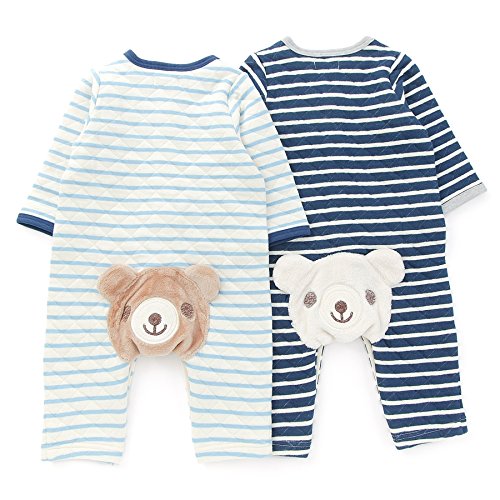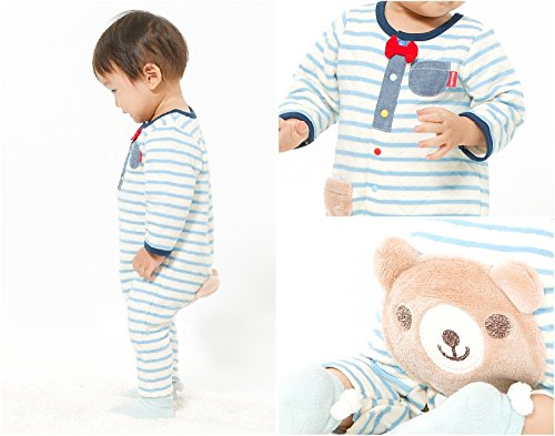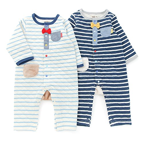 カラフルボタンや蝶ネクタイ、おしりにはくーたん、かわいいポイントがいっぱいのボーダー柄カバーオール♪素材はニットキルトだから寒い冬にもあったか☆