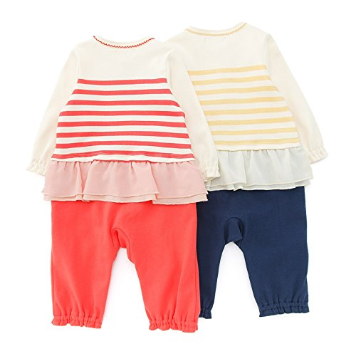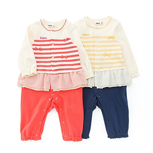 ランダムリボンが可愛い☆トップスとボトムを重ね着したようなカバーオールはピンクとイエローの二色展開^^ポップなボーダー柄もオシャレでしょ^^ギフトにもオススメです☆