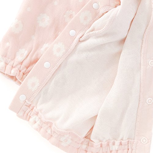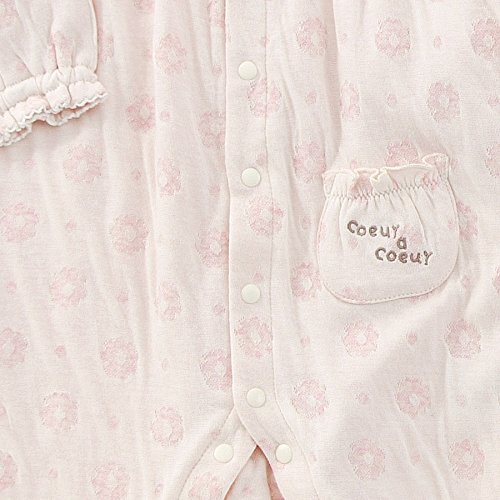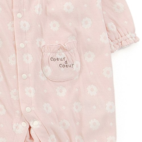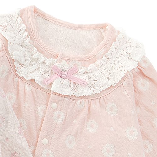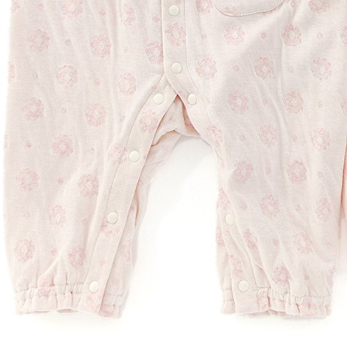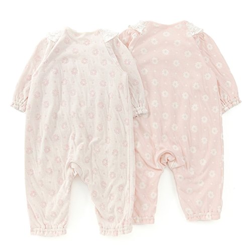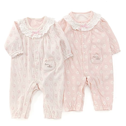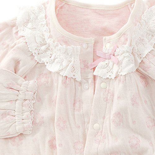 お花とドット柄がかわいいカバーオール♪やわらかくて肌触りの良い接結素材は赤ちゃんにもやさしい♪胸元のレースやリボンが華やかで魅力的♪赤ちゃんのお顔まわりを明るくさせてくれます♪