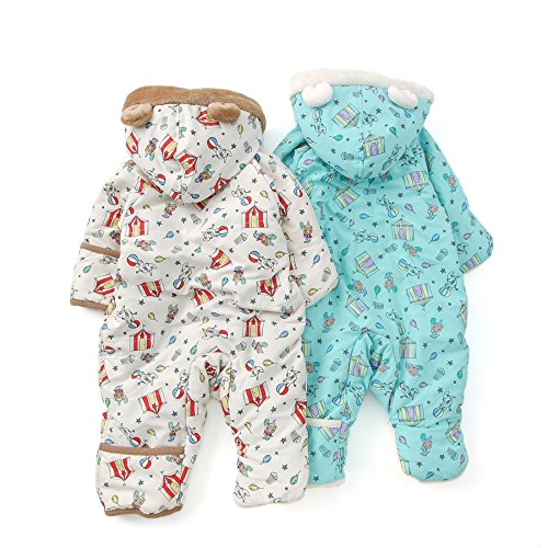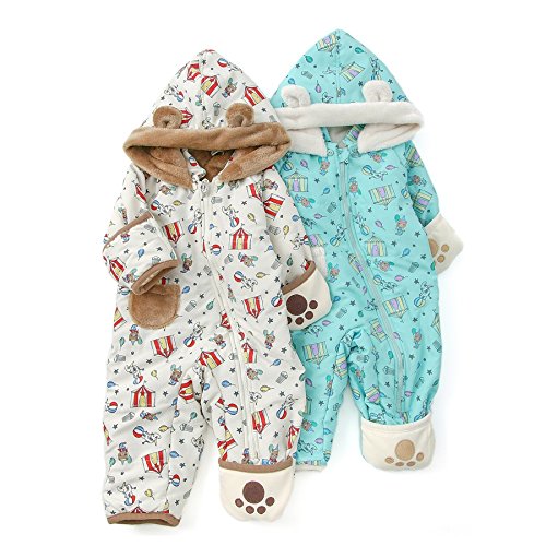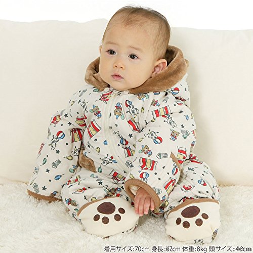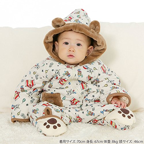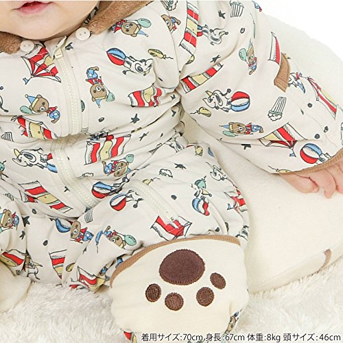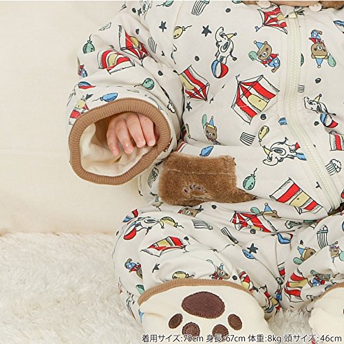 手描きサーカスプリントがかわいい♪くま耳フードジャンプスーツ☆袖口を折り返せば肉球ミトンに♪足口も折り返せば風や冷たい空気から守ります☆彡
