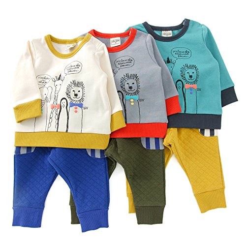 - トレーナー…本体/綿100% 衿ぐり・袖口・裾部分/綿95%・ポリウレタン5% パンツ…本体/綿80%・ポリエステル19%・ナイロン1% ウエスト・裾口部分/綿95%・ポリレタン5%