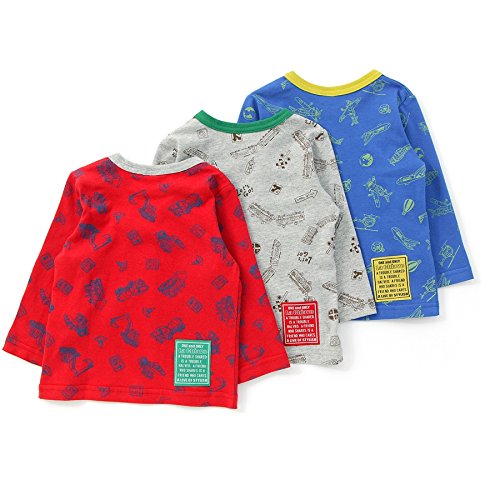 みんな大好き、電車、飛行機、働く車柄の総柄Tシャツはシンプルなのでどんなコーディネートにも合わせやすい1枚♪♪長い期間使える長袖Tシャツはお値打ちな価格も嬉しいですね☆本体綿100%☆