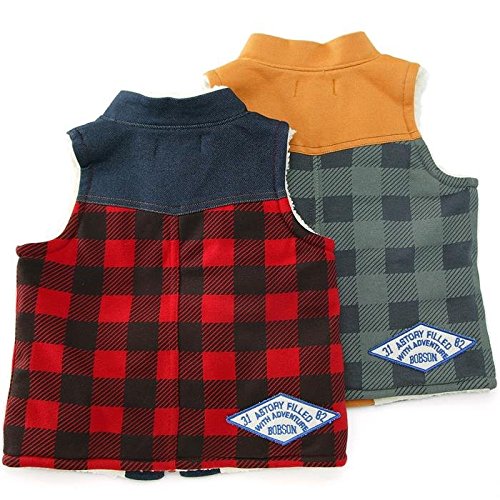 ブロックチェックニット×デニムニットのカジュアルなベスト★ボタンはBOBSONオリジナル★胸のプリント&ワッペンもBOBSONらしくカッコイイ☆裏側はボア素材なので、防寒効果もバッチリ!!ベストは動きやすく、お外遊びでも重宝します◎