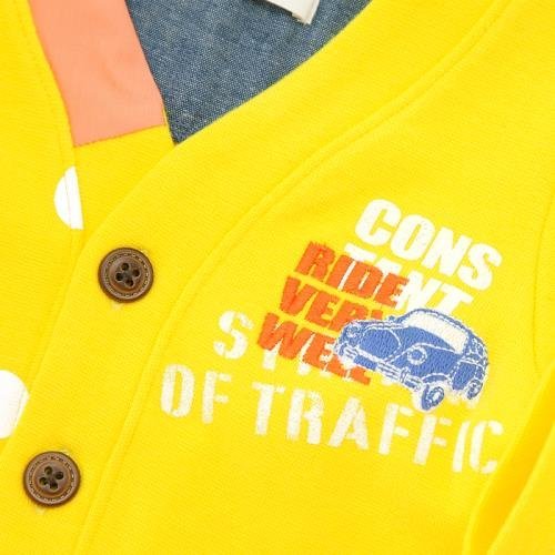 ネックラインのパッチワーク切替えや裾プリントチケット使い、右の前身頃だけドットプリントなど、形はシンプルながらもさりげないデザイン要素がいっぱいなカーディガン☆胸の刺しゅうもカッコイイ♪華やかカラーで、さっと羽織るだけでコーデのポイントになりますよ☆