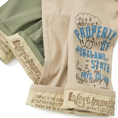 ストレッチの効いたツイルを使用し、少しゆったりとしたシルエットのカジュアル感あるパンツは薄手ながら丈夫な素材で初夏まで使える一枚☆落書き風のプリントがカッコよく、裾を折り返しても楽しめます♪