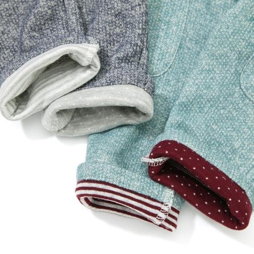 - 素材:本体/ポリエステル65%・綿35% ウエスト部分/綿95%・ポリウレタン5% フラップ部分/綿100% 撚り杢裏毛×スパンテレコ×接結天竺
