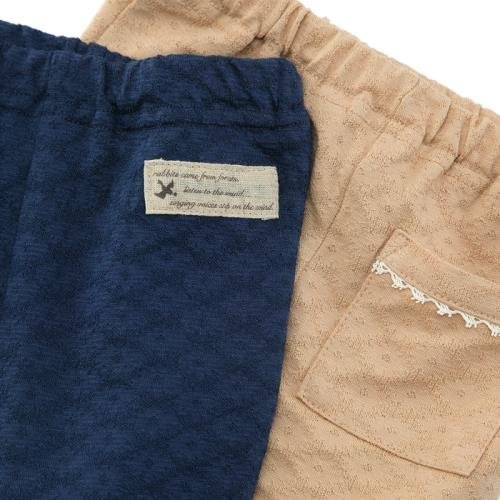 ジャガード天竺のはき心地のよいスパッツは何枚あっても便利*:・♪ 裾の花レースでかわいい表情を演出*・゜コーデに映えるナチュラルな3色をご用意しました☆*゜