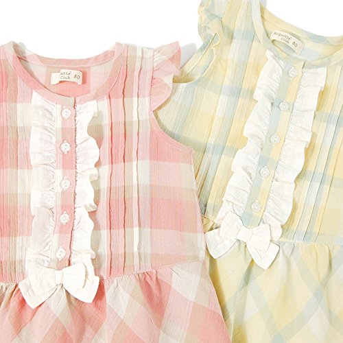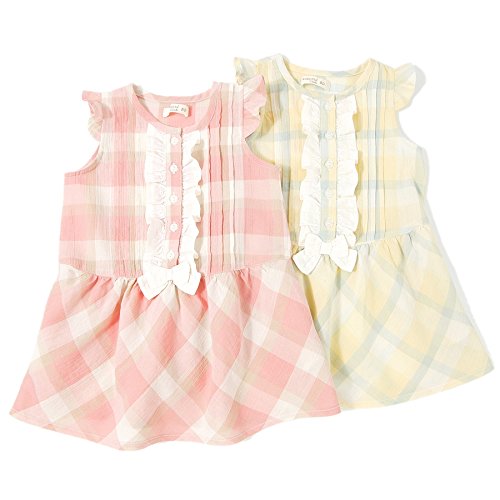 夏らしいチェックと、センターのたっぷりフリル&リボンがキュート☆スカートのボリューム感もより女の子らしいシルエットに*。♪透け感のある涼しげな素材は、ふんわりやわらかな綿100%です☆