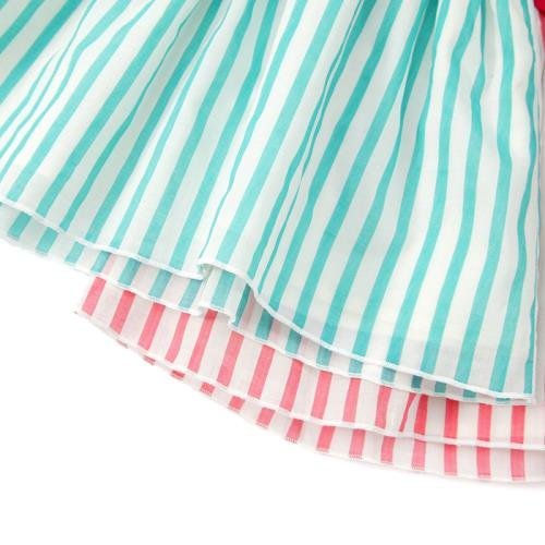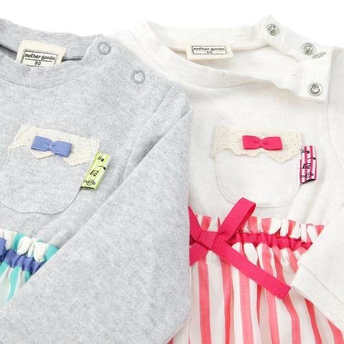 大人気のドッキングワンピースも、マザーグースらしい色あいで゚*☆上身頃にはやわらかく肌触りの良い素材を使っています*。♪少し上めの切替にリボン&さわやかなストライプで可愛さUP*・゚
