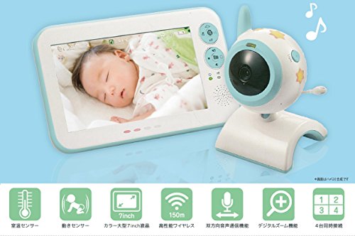 ●モーションセンサーにより、赤ちゃんが目を覚ました時に動きを感知してお知らせします。 ●親機から赤ちゃんを安心させるために子守歌を流す事ができます。 ●親機から赤ちゃんのお部屋の温度が表示できます。 ●赤外線LEDにより暗い場所でも映像の確認ができます。 ●4画面表示&カメラ増設可能 ●赤ちゃんの声を聞いて返事ができる2way機能 セット内容 カメラ×1、li-ionバッテリー(モニター用)、モニター×1、ACアダプター×2、取扱説明書 カメラスペック 周波数:2.4GHz アンテナ:Dipoleアンテナ 通信距離:約150m(見通し距離) 変調:GFSK,FHSS イメージセンサー:カラーCMOS(約30万画素) レンズ:水平画角40° 赤外線LED:9pcs 寸法:9.4(W)×15(H)×8.5(D)cm 重量:209g 動作温度:0℃~40℃ 電源:DC6V又は単4形アルカリ電池4本 マイク:有り 温度センサー:有り モニタースペック 周波数:2.4GHz アンテナ:Monopoleアンテナ 変調:GFSK,FHSS 画面:7"TFT LCD 画面カラー:フルカラー 明るさ調整:7段階 検知機能:音声応答、モーション検知、温度検知 寸法:20.8(W)×12.5(H)×2.7(D)cm 重量:404g 動作温度:0℃~40℃ 電源:DC6V又はLiバッテリー マイク:有り