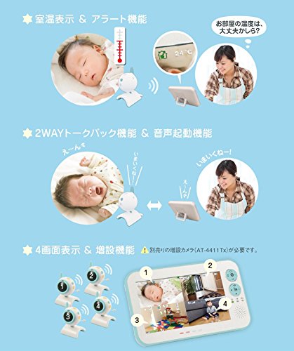 - 双方向音声通信機能(2WAYトークバック機能)、動きセンサー、高性能ワイヤレス、音声起動機能、室温センサー(室温表示&室温設定)、カラー大型7インチ液晶、デジタルズーム機能、アラート機能、4画面表示&増設機能4台同時接続(別途増設カメラが必要です)