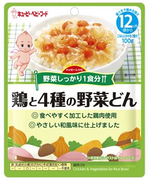 ●【商品説明】●「キユーピーベビーフード ハッピーレシピ 鶏と4種の野菜どん 100g 12ヶ月頃から」は、やわらかく仕上げた鶏肉と4種の野菜を、食べやすい和風味に仕上げました。●着色料・保存料・香料不使用。●賞味期限等の表記について西暦年/月/日の順番でパッケージに記載。●【お問い合わせ先】●キユーピーお客様相談室フリーダイヤル:0120-14-1122販売者キユーピー株式会社東京都渋谷区渋谷1-4-13製造所鳥栖キユーピー株式会社佐賀県鳥栖市田代外町701●【原産国】●日本●【原材料名・栄養成分等】●名称:どんぶりもののもと●原材料名:野菜(たまねぎ、にんじん、ごぼう、だいこん)、炒めたまねぎ、コーンスターチ、鶏肉加工品(鶏肉、じゃがいもでん粉、食塩)、ぶなしめじ、かつお節エキスパウダー、チキンエキス、こんぶエキス、食塩、しょうゆ(小麦・大豆を含む)●栄養成分表示:1袋(100g)当たりエネルギー:30kcal、たんぱく質:1.0g、脂質:0.5g、炭水化物:5.4g、食塩相当量:0.4g※この表示値は目安です。●【殺菌方法】●気密性容器に密封し、加圧加熱...