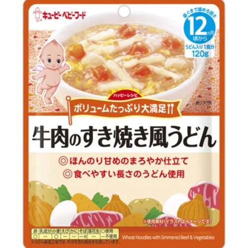 ●【商品説明】●「キユーピーベビーフード ハッピーレシピ 牛肉のすき焼き風うどん 120g 12ヶ月頃から」は、食べやすい長さのうどん、牛肉、野菜を卵でとじた、ほんのり甘めのすき焼き風うどんです。●着色料・保存料・香料不使用。●賞味期限等の表記について西暦年/月/日の順番でパッケージに記載。●【お問い合わせ先】●キユーピーお客様相談室フリーダイヤル:0120-14-1122販売者キユーピー株式会社東京都渋谷区渋谷1-4-13製造所鳥栖キユーピー株式会社佐賀県鳥栖市田代外町701●【原産国】●日本●【原材料名・栄養成分等】●名称:調理麺●原材料名:うどん(小麦を含む)、野菜(にんじん、じゃがいも)、鶏卵、コーンスターチ、しょうゆ(小麦・大豆を含む)、炒めたまねぎ、牛そぼろ、砂糖、食塩●栄養成分表示:1袋(120g)当たりエネルギー:58kcal、たんぱく質:2.3g、脂質:1.2g、炭水化物:9.6g、食塩相当量:0.6g※この表示値は目安です。●【殺菌方法】●気密性容器に密封し、加圧加熱殺菌●【保存方法】●直射日光を避け、常温で保存してください。●【ご注...