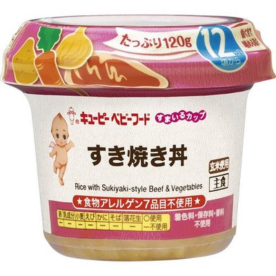 ●【商品説明】●「キユーピーベビーフード すまいるカップ すき焼き丼 12ヵ月頃から」は、牛肉と野菜を和風だしで炊いた、すき焼き味の玄米ごはんです。●卵・乳成分・小麦・えび・かに・そば・落花生不使用。● 12ヵ月頃からのお子様に。●コンパクトに見えて、たっぷり120g入っています。●成長に合わせた具材の大きさ・固さで、だしや素材のうま味をいかした深い味わいにしています。●そのままでもおいしく召し上がれます。●賞味期限等の表記について西暦年/月/日の順番でパッケージに記載。●【お問い合わせ先】●販売元キユーピー株式会社お客様相談室フリーダイヤル:0120-14-1122●【原産国】●日本●【製品仕様】●すまいるカップの容器の特長・コンパクトで持ち運びやすいのでお出かけにもぴったり・中身が見える・家でも外でもお皿いらず・電子レンジ加熱OK●【原材料名・栄養成分等】●名称:米飯類原材料名:野菜(にんじん、じゃがいも、たまねぎ)、玄米(国産)、コーンスターチ、牛そぼろ、しょうゆ(大豆を含む)、砂糖、炒めたまねぎ、かつお節合せだし、食塩 栄養成分表示:1個(120g...