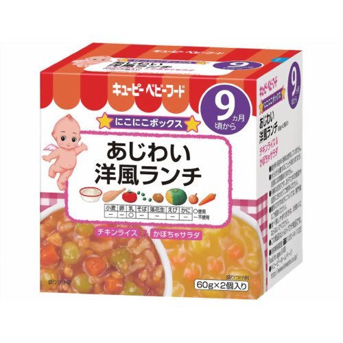 ●【商品説明】●「キユーピー にこにこボックス あじわい洋風ランチ 60g×2個入り 9ヶ月頃から」は、チキンライスとかぼちゃサラダのベビーフードセットです。●よく炒めた玉ねぎやりんごの裏ごしなどを加えた、野菜の甘みたっぷりの食べやすいチキンライスと、裏ごししたかぼちゃに、野菜、いも、果実を加え、ほんのり甘めに仕上げたサラダのセットです。●素材の風味をいかし、うす味に仕上げています。●月齢に合わせた大きさや固さに調整しています。●温めずに、そのままでもおいしく召しあがれますので、お出かけ時にも便利で、赤ちゃんの笑顔も広がります。●【お召し上がり方】●温めずに、そのままでもおいしく召しあがれます。●よくかき混ぜてからあげてください。●○お湯で温める場合ふたをはがさずに、容器のままお湯に約2分-3分つけてください。●沸騰はさせないでください。●○電子レンジで温める場合(1)容器のふたを完全にとりのぞいてください。●(2)耐熱容器(金箔などの金属塗料が使われていないもの)に移しかえ、ラップをかけて電子レンジで温めてください。●※加熱時間の目安は、出力500Wまたは6...