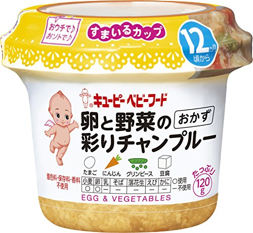 ●【商品説明】●「キユーピーベビーフード すまいるカップ 卵と野菜の彩りチャンプルー 12ヵ月頃から」は、たっぷりの卵と野菜を使用し、彩り豊かに仕上げたベビーフード おかずタイプです。●コンパクトで持ち運びやすい容器は、家でも外でもお皿いらず。●電子レンジ加熱OK。●成長に合わせた具材の大きさ・固さ。●素材のうま味をいかした深い味わい。●そのまま食べてもおいしい。●ごはんやパンと一緒にどうぞ。●着色料、保存料、香料不使用。●12ヶ月頃から。●【原材料に含まれるアレルギー物質】●卵、小麦、大豆●【お召し上がり方】●そのままおいしく召し上がれます。●(1)シールを完全にはがします。●(2)キャップを再びしっかりとはめます。●(3)電子レンジで温めます。●(500-600W:10秒)※オート加熱不可。●(4)よく混ぜてから、あげてください。●【ご注意】●発火・変形を避けるため、お召し上がり方の加熱手順、条件をお守りください。●温めた後に、中身がはねてヤケドをする恐れがありますのでご注意ください。●ヤケドをしないようにお子さまにあげる前に温度をお確か...